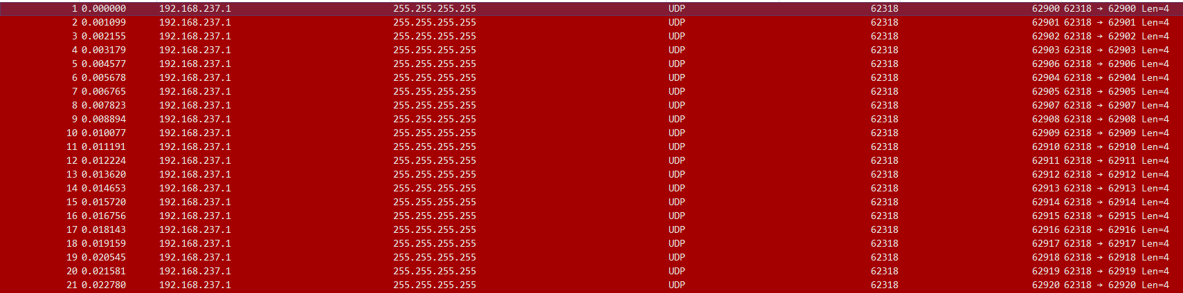 在谈论联机方式之前,我想先谈谈文明 6 局域网联机的实现方式。简单用 WireShark 抓包看看,我们可以得知,其采用了发送广播包的方式寻找局域网中可用主机的方式,且向 62900-62999 端口都发送了,估计是防止端口占用的情况。