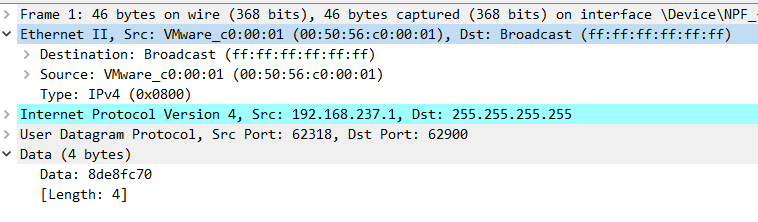 再看看包内容,可以发现这既是一个二层广播包,又是一个三层广播包(什么是二层广播和三层广播请自行搜索)。